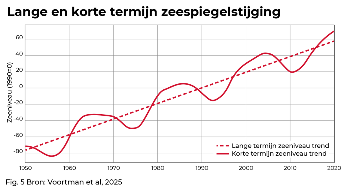 Volgens het IPCC en andere instituten versnelt die stijging momenteel echter doordat de concentratie van broeikasgassen stijgt door menselijk handelen, waardoor de aarde versneld zou opwarmen. Als dit klopt, dan heeft dit enorme gevolgen voor de wereld. Instituten als het KNMI baseren hun prognoses voor de toekomst op basis van de aanname van een versnelling van de zeespiegelstijging. Volgens sommige prognoses van het KNMI zou de stijging kunnen oplopen tot meer dan 120 cm in 2100. Voortman doet geen concrete voorspellingen, maar hij laat wel zien dat de projecties veel hoger liggen dan wat daadwerkelijk wordt gemeten.