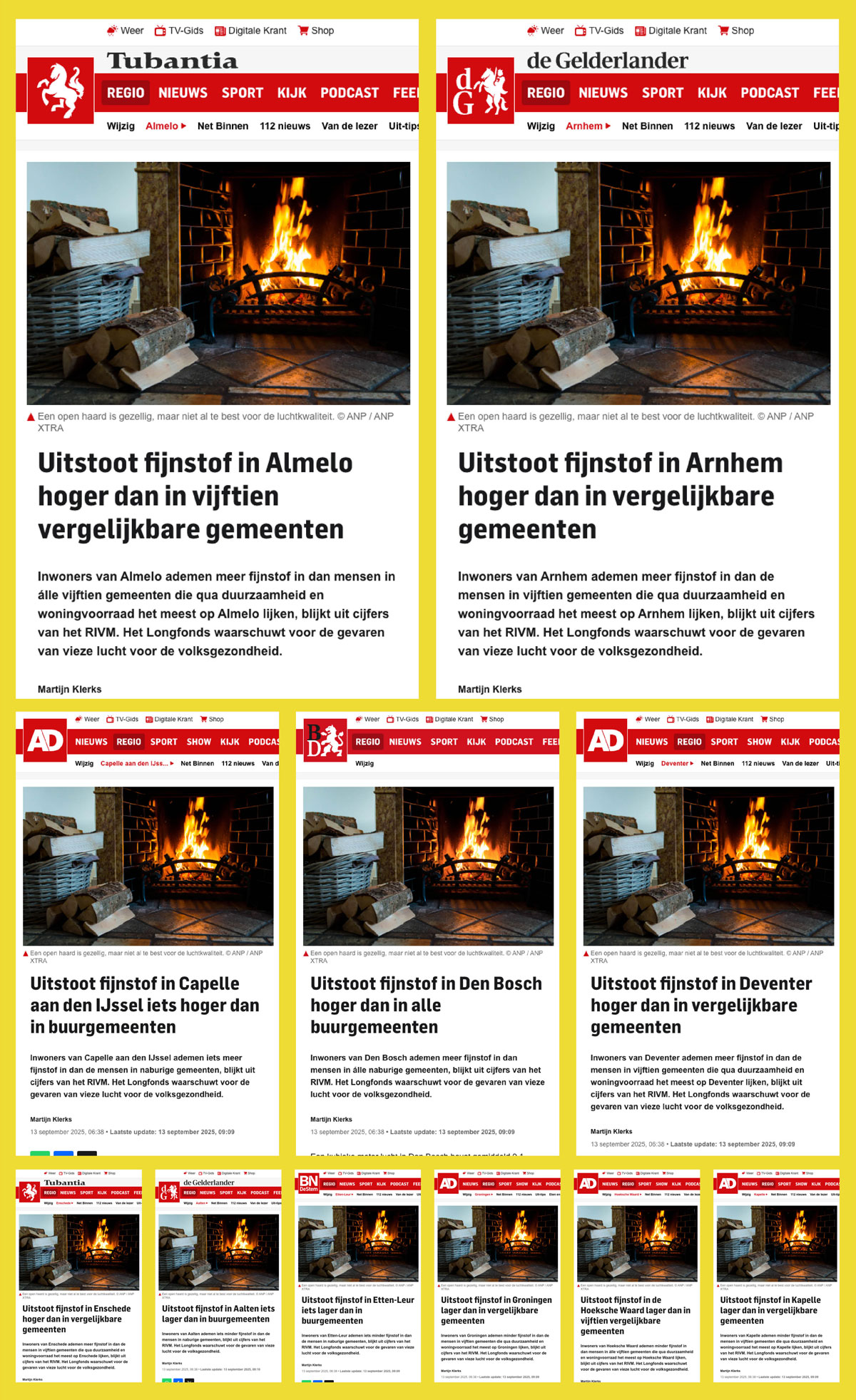 ‘Uitstoot fijnstof buurgemeenten’. Wie woorden van die strekking invoert op Google, komt sinds vorige week tientallen soortgelijke nieuwsberichten tegen onder het tabblad nieuws. Bijna al deze berichten zijn afkomstig van het Belgische mediaconglomeraat DPG. Alleen de plaatsnamen – van Utrecht tot Winterswijk, van Alphen-Chaam tot Steenwijkerland – zijn anders. Voor de rest stellen de berichten allemaal dat fijnstof als gevolg van houtstook de grote boosdoener is. DPG Media, uitgever van onder andere het AD en de meeste regionale titels, erkent na vragen van De Andere Krant veel van die berichten in de basis hetzelfde zijn. Gevraagd naar de journalistieke waarden, onafhankelijkheid en betrouwbaarheid van deze generieke berichten, reageert een woordvoerder dat dit bij de samenwerking van landelijke en regionale redacties hoort. “Binnen deze samenwerking wisselen we content uit en werken we aan verhalen die in de basis gelijk kunnen zijn, maar worden toegespitst op een regio of gemeente. Lezers vinden het belangrijk te weten hoe de situatie in hun eigen leefomgeving is”, aldus DPG, die benadrukt dat er wel degelijk variatie is: “Als de cijfers voor gemeenten identiek zijn, zal ook de formulering identiek zijn. Als de gegevens verschillen, passen we de tekst daarop aan.”