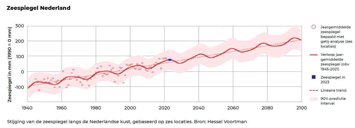 De zeespiegel stijgt weliswaar, maar dit gaat zeer geleidelijk met zo’n twee millimeter per jaar en begon bovendien al in de 19e eeuw, ruim voordat we massaal broeikasgassen gingen uitstoten. Het Delftse zeespiegelinstituut Deltares flirt de laatste jaren met het idee dat er wel degelijk een versnelling van de zeespiegelstijging langs de Nederlandse kust optreedt sinds 1993. Dit werd echter weersproken in een publicatie door de Nederlandse ingenieur Hessel Voortman. In onderstaande afbeelding uit die publicatie is mooi te zien dat de zeespiegel een cyclus doorloopt van zo’n 18 jaar, wat te maken heeft met de stand van de maan. In 1993 zaten we in een dal, nu verkeren we op de piek van de cyclus. Trek je daartussen een rechte lijn, dan lijkt het inderdaad harder te gaan, zoals Deltares claimt. Maar niet te vroeg juichen dus, normaal gesproken buigt de zeespiegel de komende jaren weer naar beneden af. En waar hebben we het over, 2 mm per jaar of 3 mm per jaar. Het zijn stijgingen waar waterbeschermers in Nederland geen seconde van wakker liggen.
